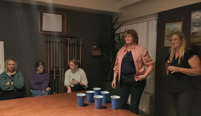 Onder het genot van een portie patat en een drankje werd er volop bijgekletst. De sfeer zat er goed in en die werd nog beter toen Han de beerpongwedstrijd startte. Wat begon als een onschuldig potje, eindigde in een bloedfanatieke strijd om eeuwige dorpsroem.